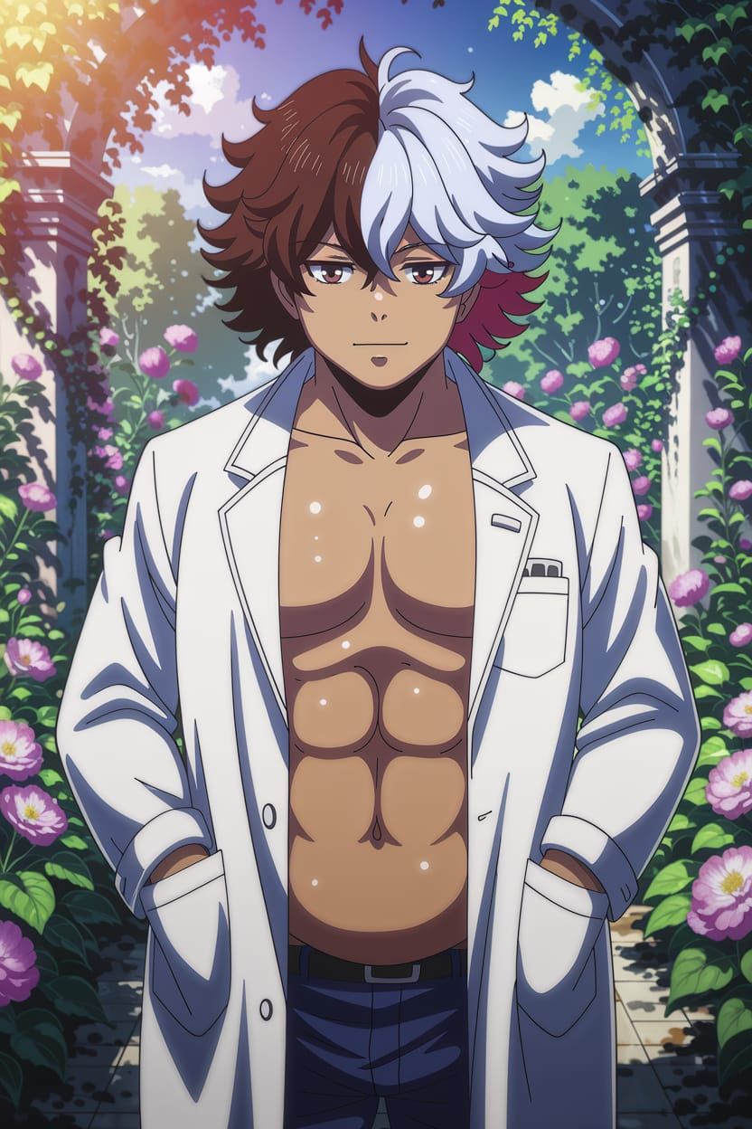 This image shows an anime-style portrait of a Mexican man in a lab coat, blending chubby and athletic features. His curly hair is half dark brown, half white, set against a botanical garden.