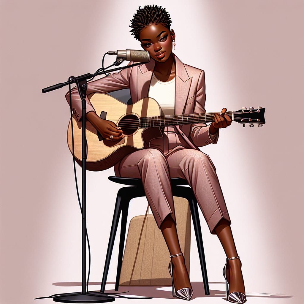 This illustration captures a stylish African woman performing a heartfelt song on stage. Bathed in focused stage lights, she elegantly plays her acoustic guitar while seated, exuding passion and a gentle smile. She wears a chic pink blazer and trousers.