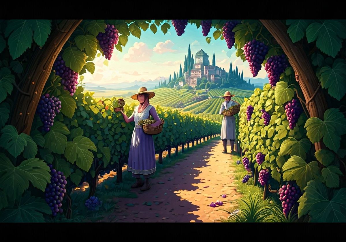 A vibrant image of grape harvesters amidst lush vineyards and fantastical creatures. The artwork features intricate details, rich textures, and a magical realism touch in an aquarelle style.