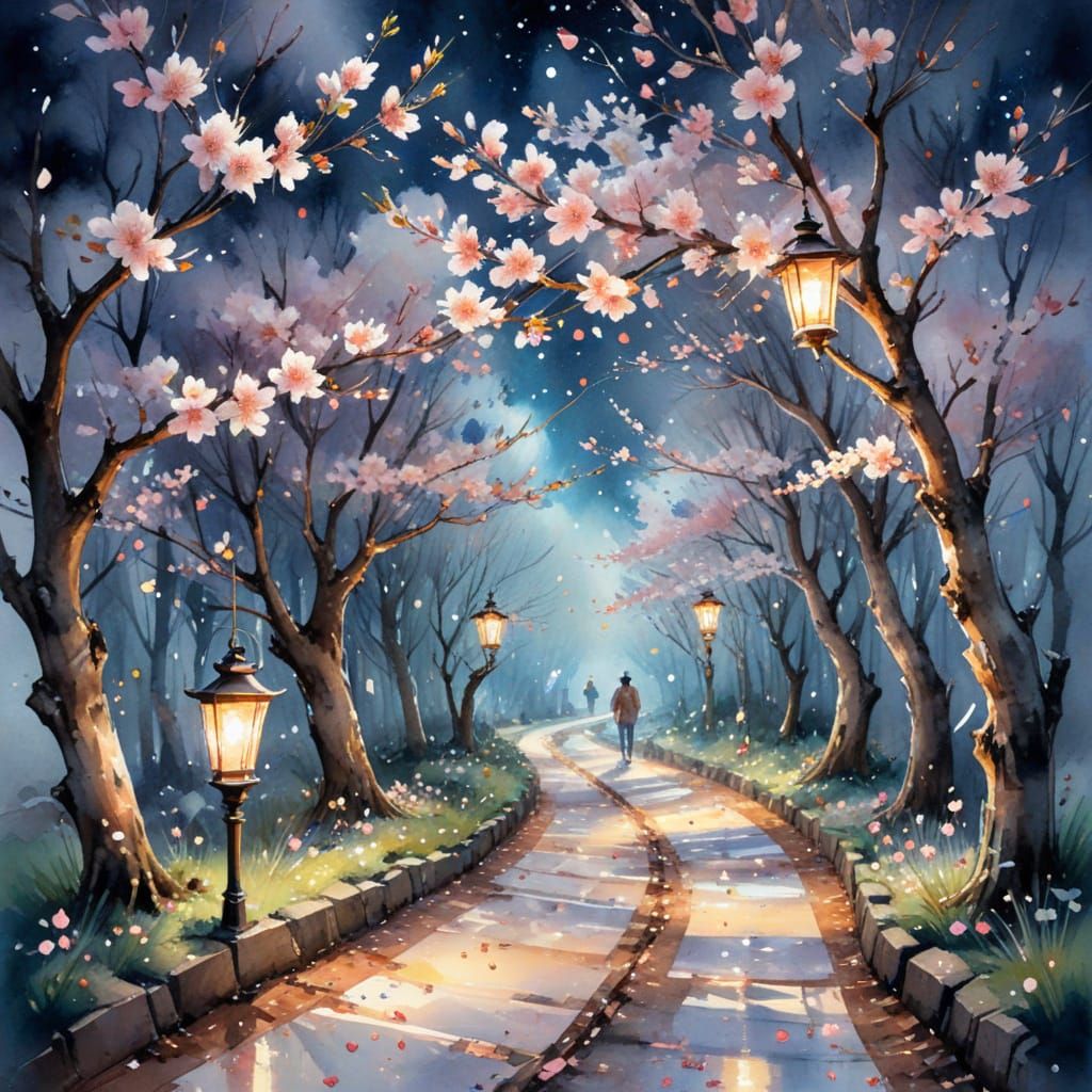This image shows a watercolor painting of a cherry blossom grove at night. Lanterns illuminate a winding path as petals fall like snow. The artwork blends expressive watercolour techniques with cinematic stylization.