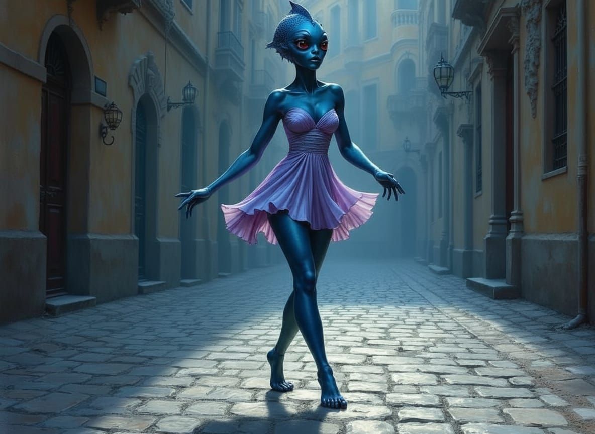 A full body oil painting of an anthropomorphic fish-woman with blue scales and gills, wearing a lavender silk minidress. Impressionistic style captures her on a cobblestone plaza.