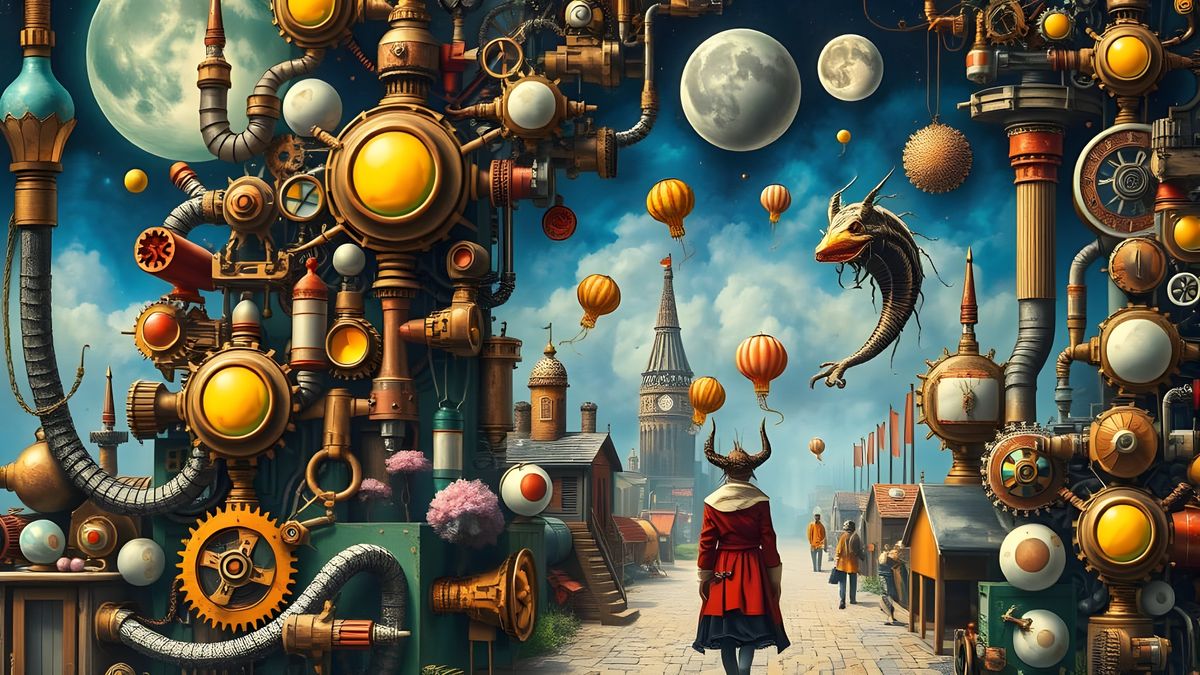 This image shows a surreal collage of an Isekai anime painting. The artwork features a town of machinery, hybrid creatures, and discontinuous reality in vibrant, contrasting colors with diffuse lighting.