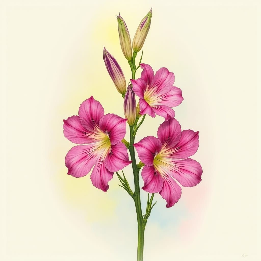 This image shows three gladiolus flowers with magenta and pink petals, set against a pastel watercolor backdrop. The artwork features fine line details, geometric patterns, and a highly detailed, realistic style.