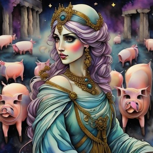 A watercolor painting depicts the Greek sorceress Circe with a look of indifference towards her transformed companions, the pigs.