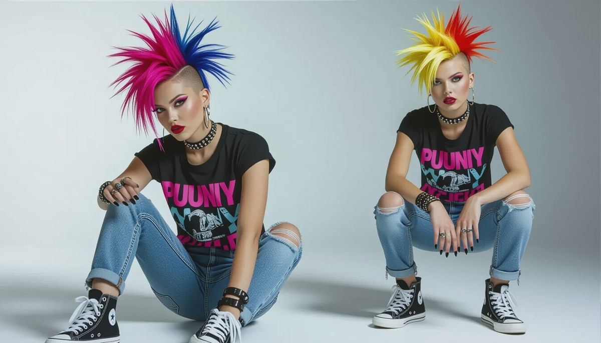 This image shows a punk girl with an asymmetrical, colorful hairstyle, wearing a graphic tee and distressed jeans. The photo features shallow depth of field and natural lighting.