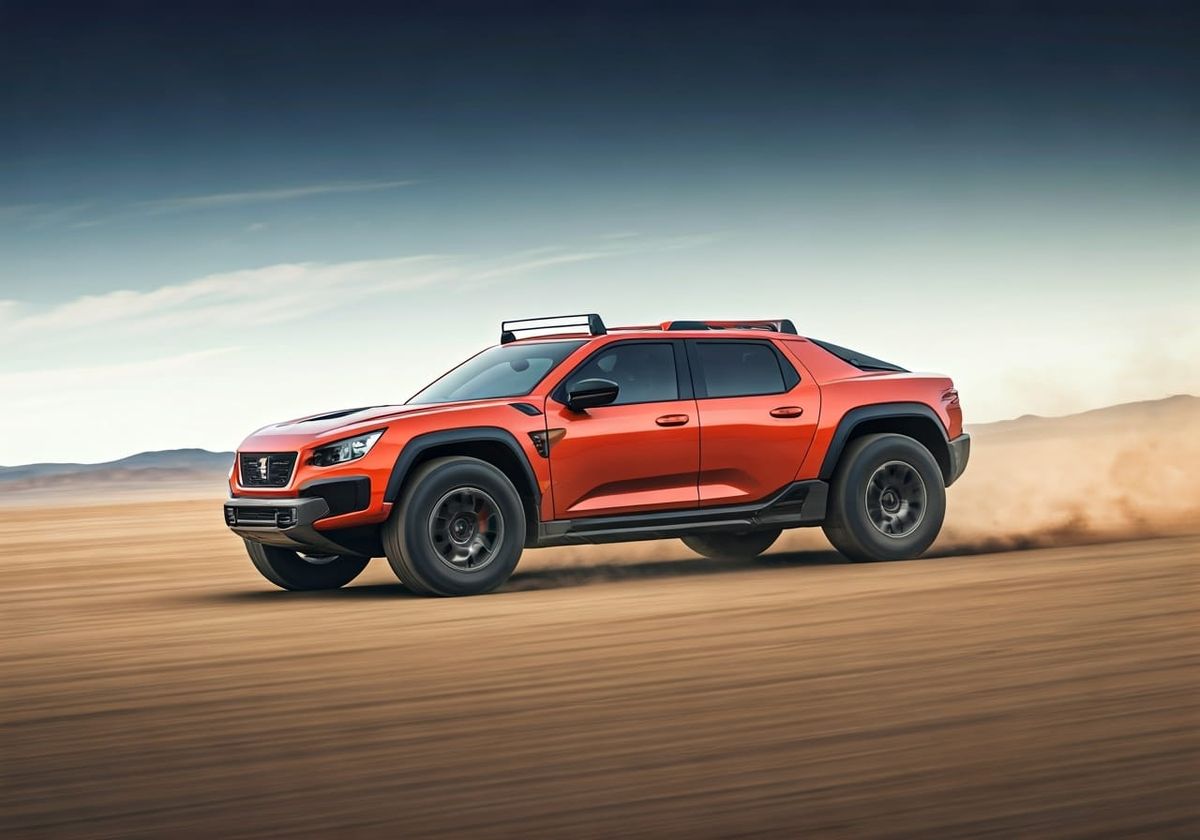 This image shows a concept car performing stunts in a desert landscape under bright sunlight. The scene is rendered as a detailed and cinematic digital painting with dramatic lighting.