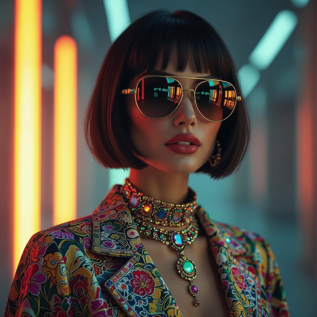 A hyperrealistic image of a woman with a bob haircut and sunglasses, adorned with detailed colorful clothing and futuristic jewellery. Shot with cinematic lighting, it creates a dramatic and atmospheric mood.