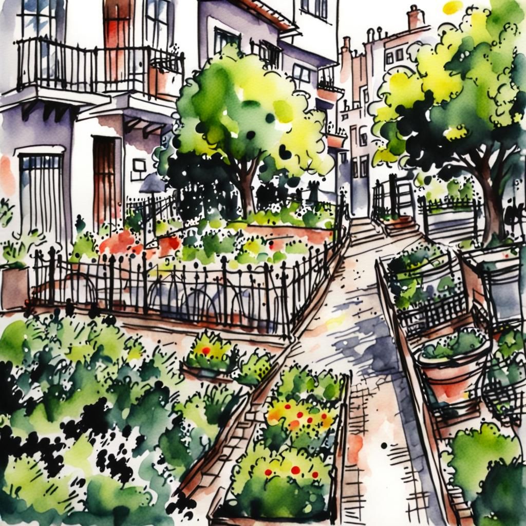 This image shows an ink and watercolor urban sketch of a garden. The loose, expressive style captures the charm of a city garden scene.