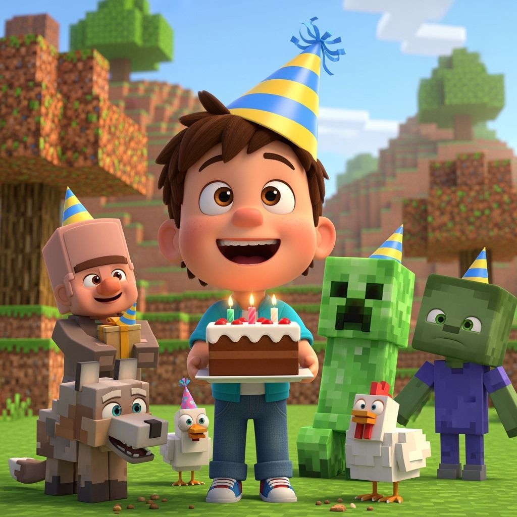 This image shows a boy holding a Minecraft cake, in a Disney-Pixar animation style. Minecraft characters surround him in a brightly lit, whimsical birthday party environment. The characters are rendered in soft, rounded style.
