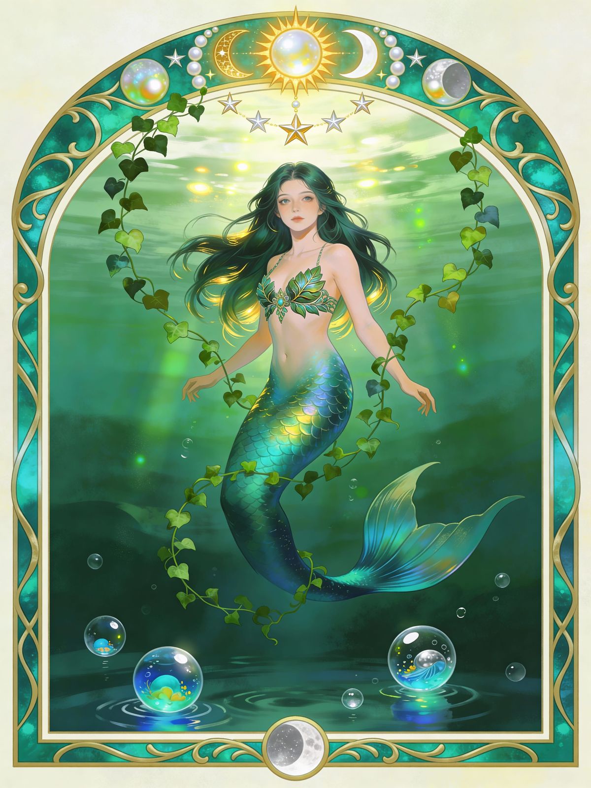 A highly detailed fantasy illustration of an elegant mermaid with a shimmering tail, surrounded by ivy vines and an ornamental frame. The artwork features a palette of emerald, petrol, and gold.
