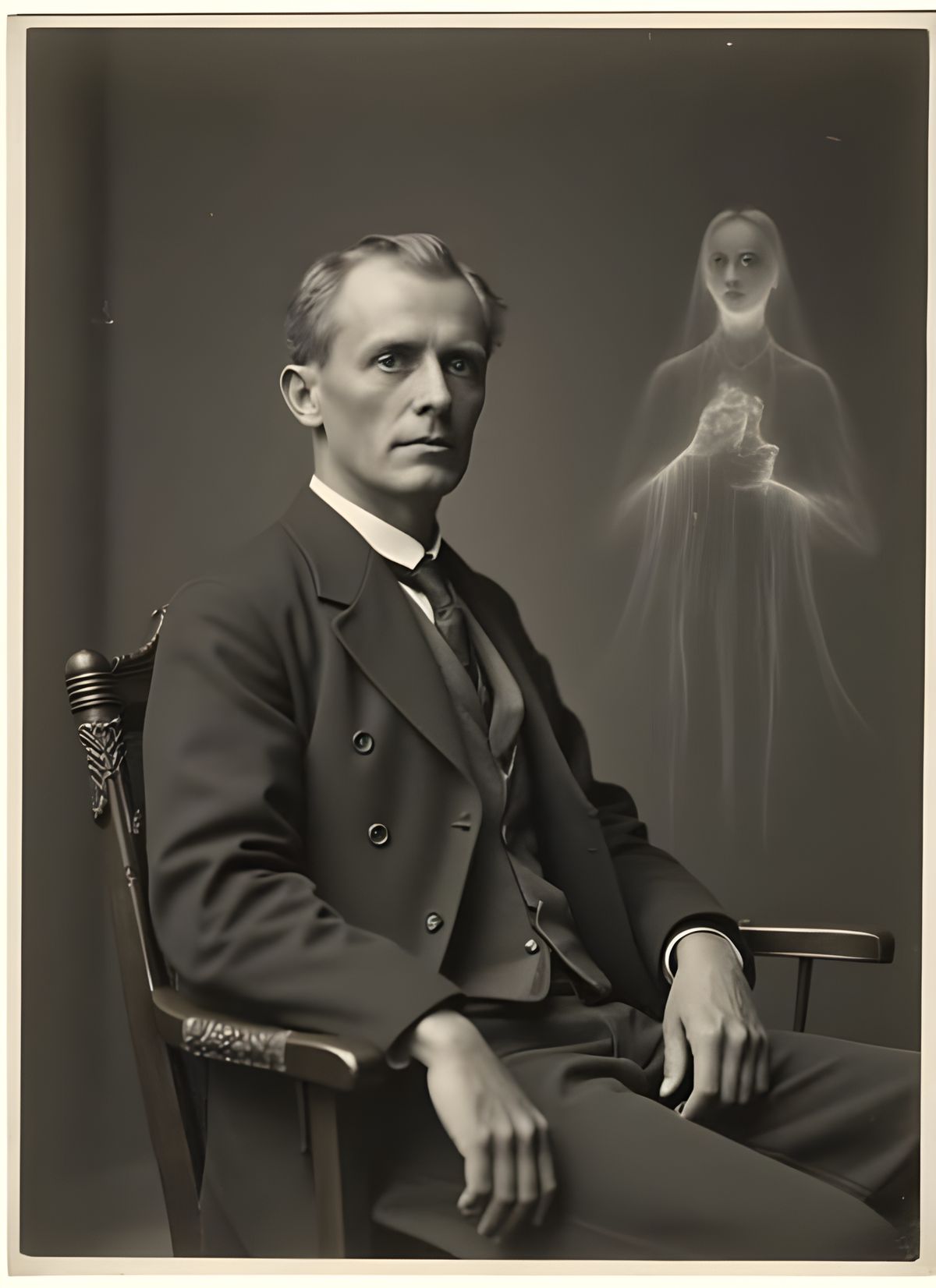 A classic black and white portrait of a man in a formal suit, exuding a sense of melancholy and stillness, with a subtle overlay effect and heavily textured, aged sepia tones.