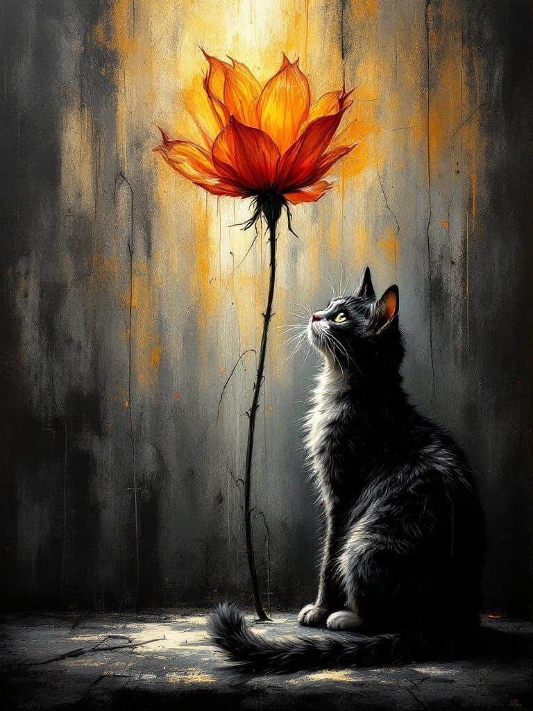 This image showcases a majestic cat seated under a vibrant, split-background flower, bathed in dramatic, chiaroscuro lighting with urban symbolic elements, blending classical composition with street art rawness.