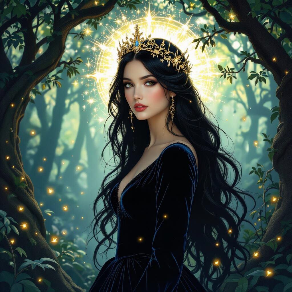 This image shows a woman with long black hair wearing a starlight crown at the edge of a forest. The hyperrealistic image is rich in color and features Art Nouveau and fantasy elements.