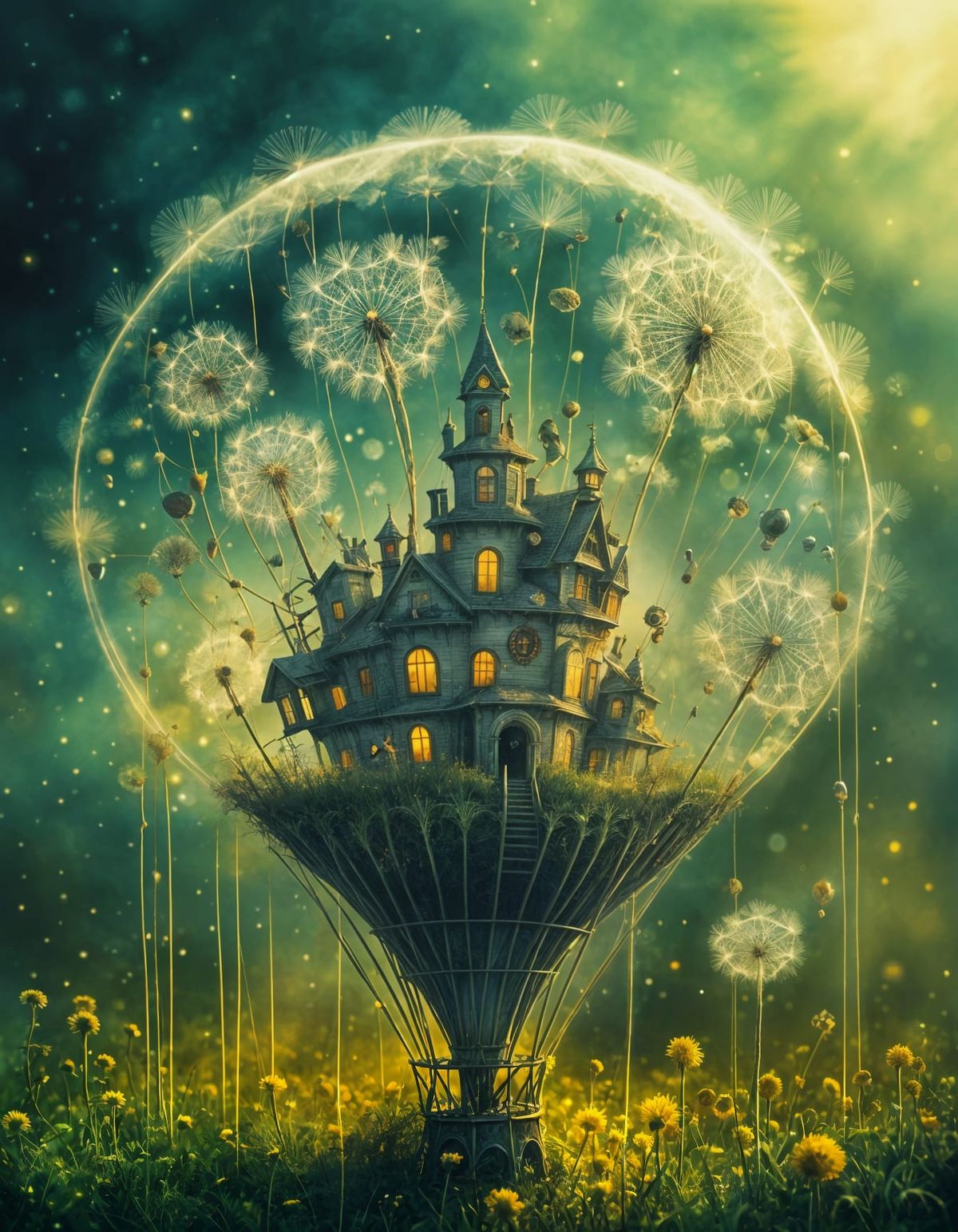 A close-up image shows a dandelion in a wildflower field. Tiny hot air balloons float among the seeds in a whimsical, dreamlike scene with flowing light and intricate details in a digital art style.