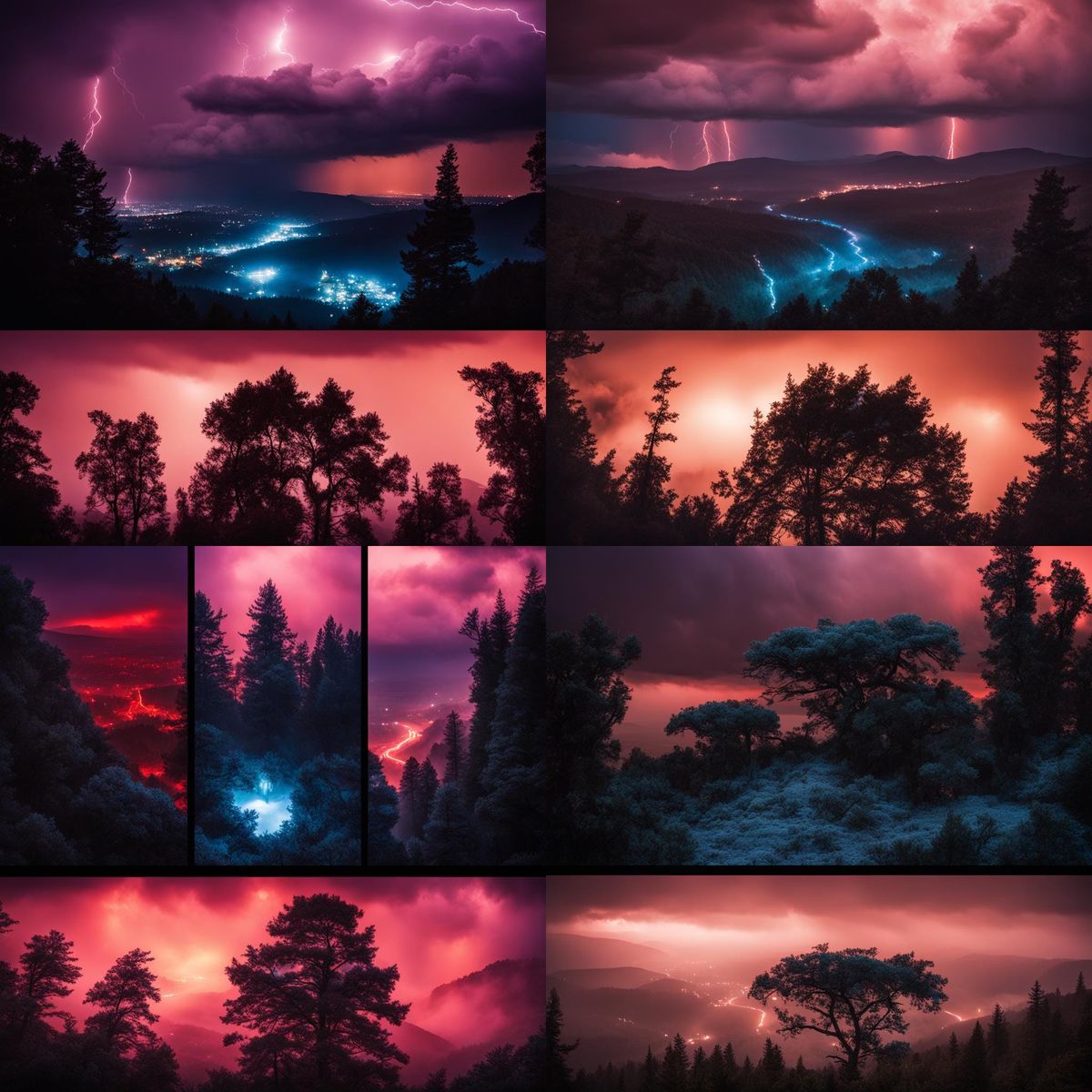 This image shows a landscape view of the Hazbin Hotel from a mountaintop during a thunderstorm. Dark clouds fill the sky, trees sway, and blue lighting illuminates the scene.
