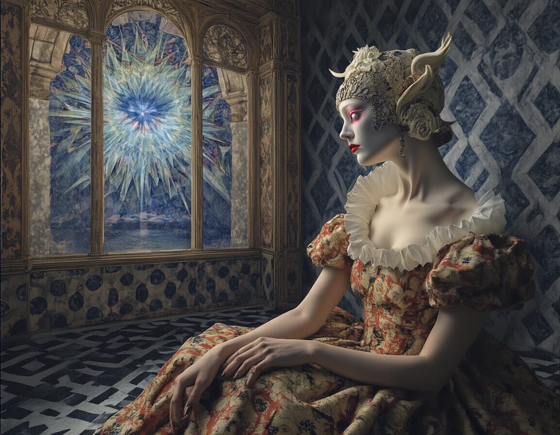Götterdämmerung 3D broken jagged fractured fairy tales semiconductor wafer couture special eyes patterned reflections symbolic dreams and neuromorphic abstract holograms and AI evil replicant wearing the latest neuromorphing fashion tenebrism lighting masterpiece 3D collage by Fornasetti brilliantly ...
