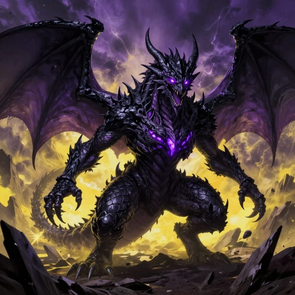 A terrifying, colossal dragon with obsidian scales and burning purple eyes emerges from a storm. Its wings cast shadows over a jagged landscape. Dark fantasy concept art with dramatic lighting.