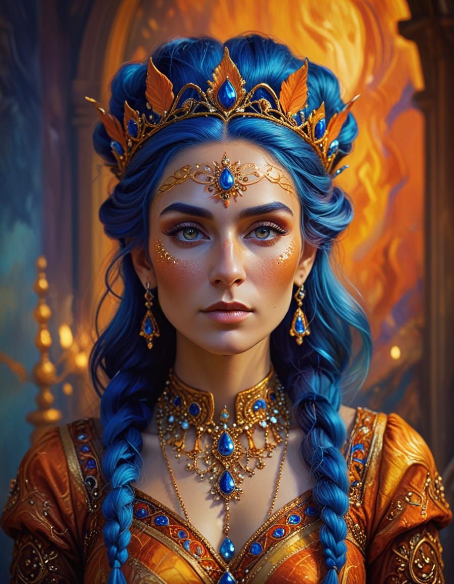 This image depicts an older elf queen in vibrant, fauvist-inspired regalia, featuring intricate face paint and delicate golden accents. The queen's burnt-orange dress and jewelry are set against a soft, gradient background in deep blues.