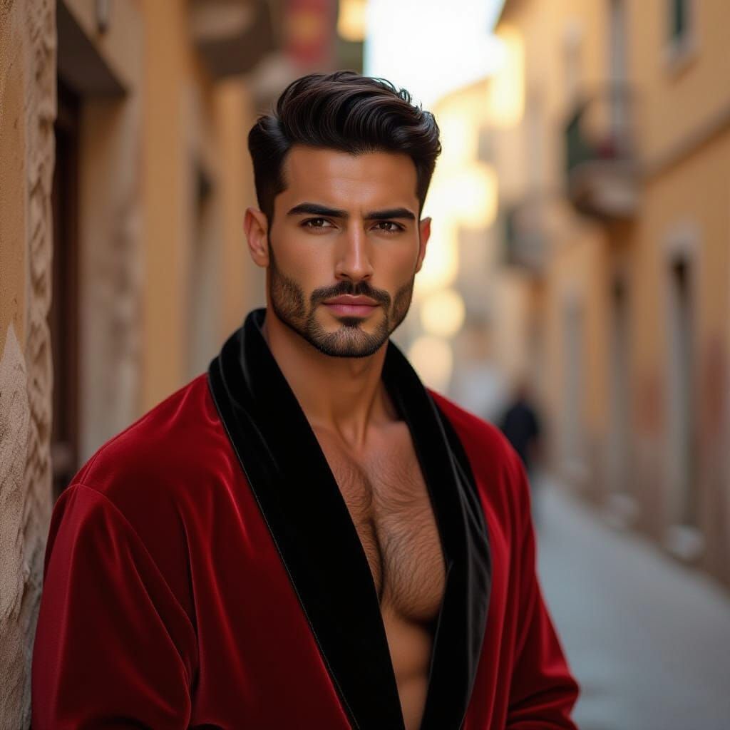 A striking picture of a handsome man in a red velvet robe, set against a textured, golden backdrop. The portrait features vibrant colors, deep shadows, and a style reminiscent of Impressionist painting.
