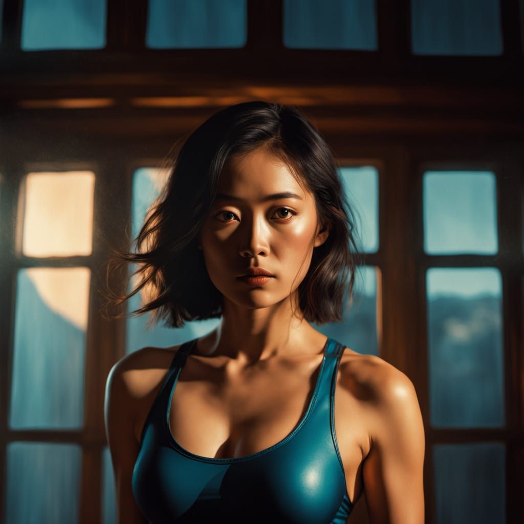 A vintage film noir image of an Asian woman in a boxing pose. This vibrant oil painting features glistening wet hair, triadic colors, and soft natural light, reminiscent of futuristic concept art.