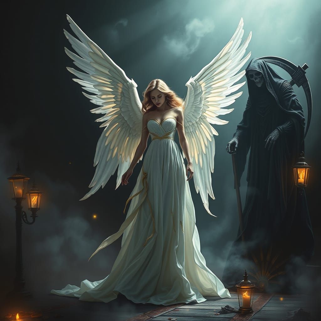 A dramatic image of an angel and the grim reaper meeting in a mystical realm, featuring eerie lanterns, wispy fog, and intense contrasts, inspired by Beksiński's dramatic lighting and Giger's symbolism