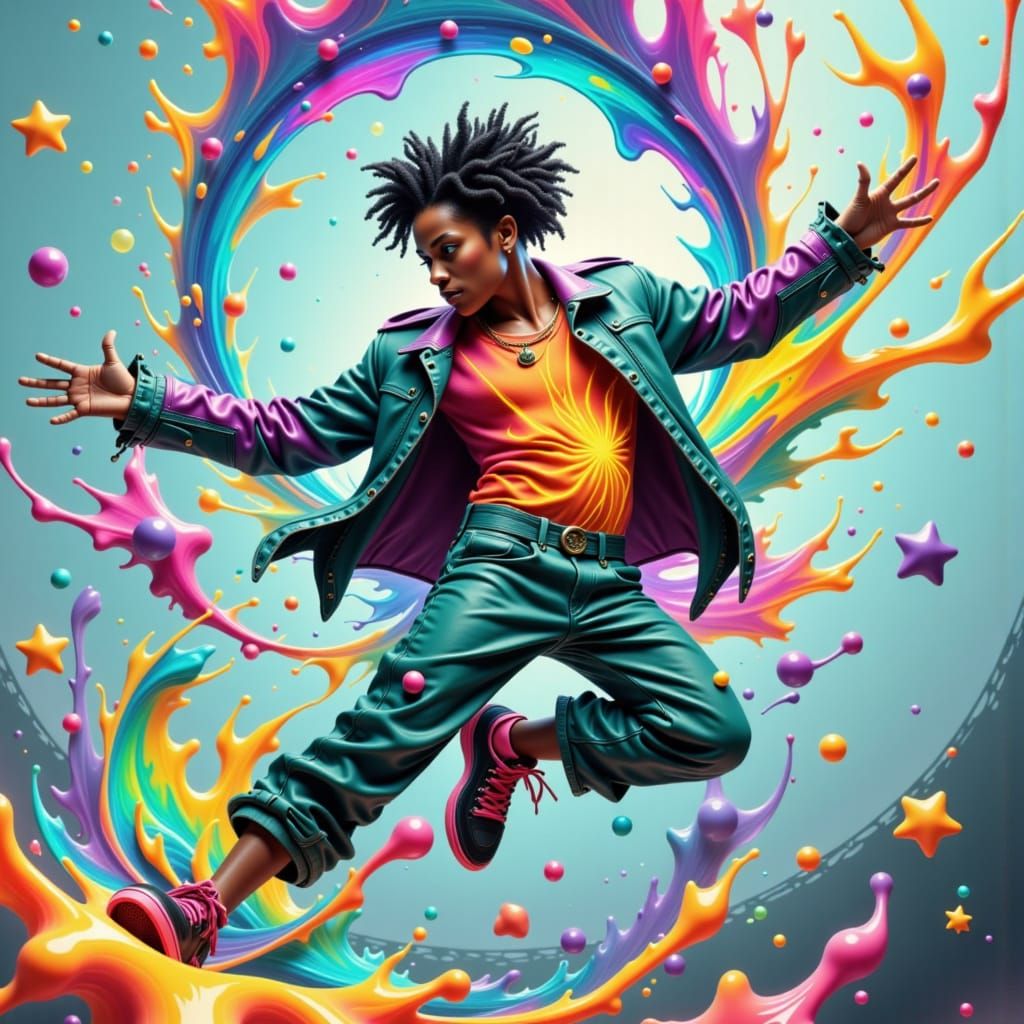 A vibrant hip hop dancer is captured mid-splash, surrounded by bioluminescent neon inks. The image features deep colors and 3D shading in an abstract, polychromatic style.