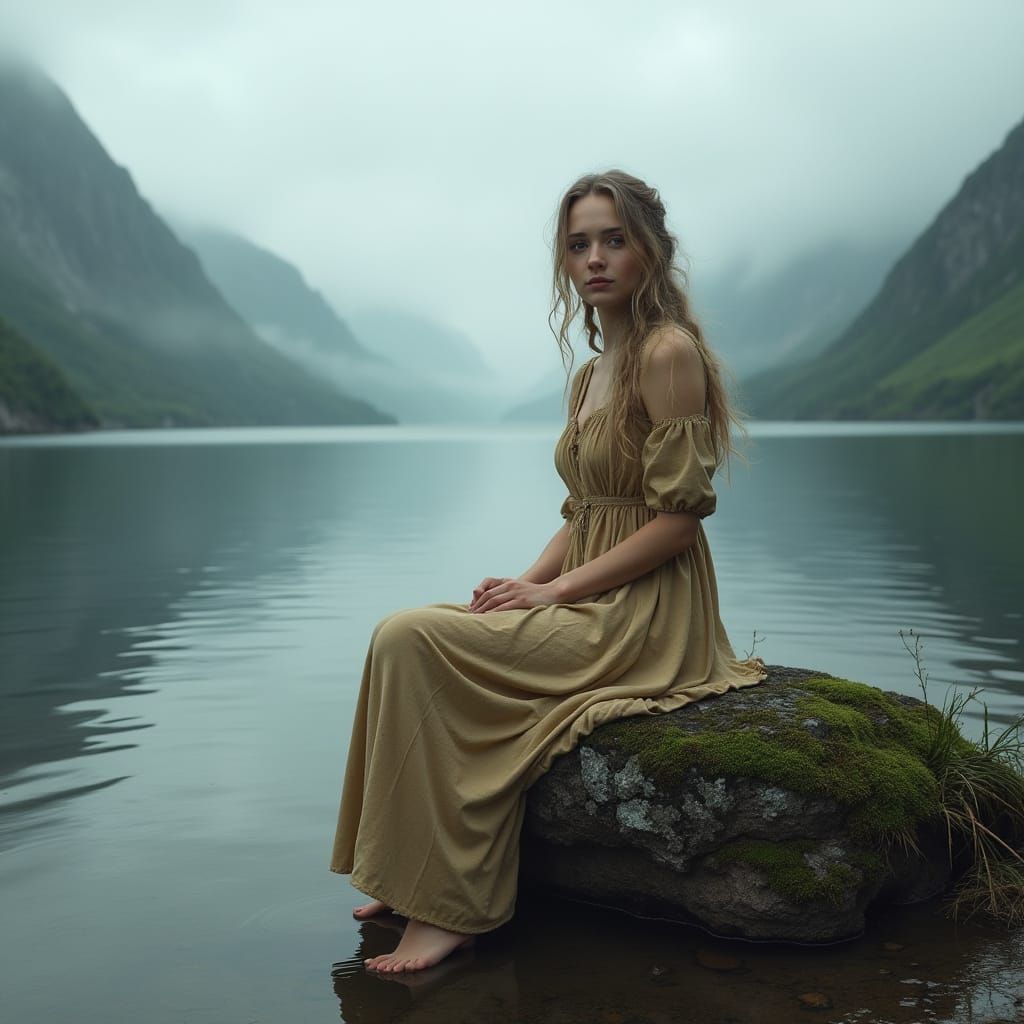 A captivating image of a Nordic siren in a linen gown, sitting on a rock near Norwegian fjords. Misty mountains and calm waters create a serene, mystical atmosphere in a digital painting.