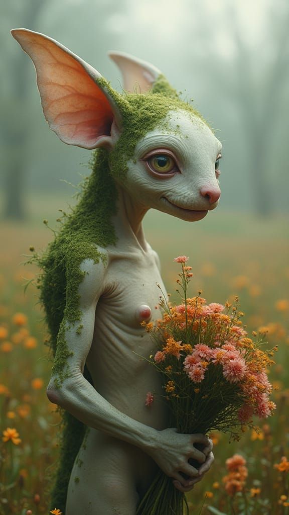 Long Take. A grotesque, distorted portrait of a sweet, strange, ethereal creature with expressive, sad, eyes, a tiny upturned nose and a thin, graceful back covered in mossy fur, picking a large bouquet of flowers in a beautiful field, in the style of H.R. Giger's biomechanical nightmares, with hints ...