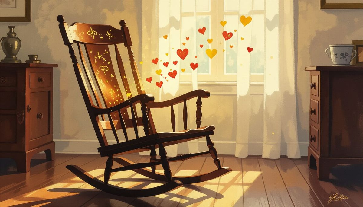 This image shows a vintage rocking chair surrounded by golden memories in a peaceful room. The chair is crafted from polished wood with glowing symbols, rendered as vibrant alcohol ink painting.