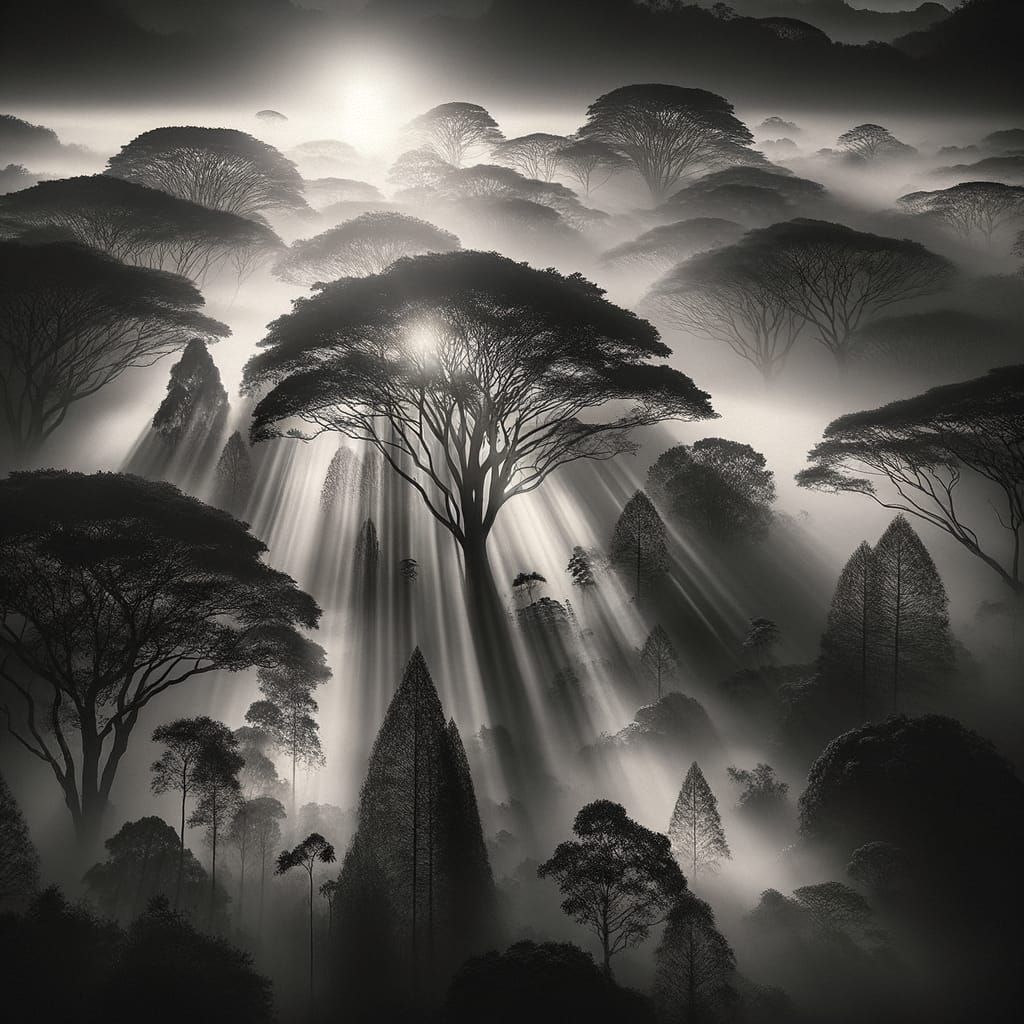 A stunning image of a misty forest at dawn with sunlight filtering through the trees. The scene features cinematic lighting and evokes the feel of classic black and white photography.