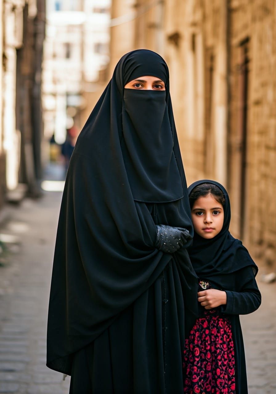 This image shows a Muslim woman in a black niqab and abaya walking in Tarim, Yemen, with her daughter. The professional photograph features natural lighting and a shallow depth of field.