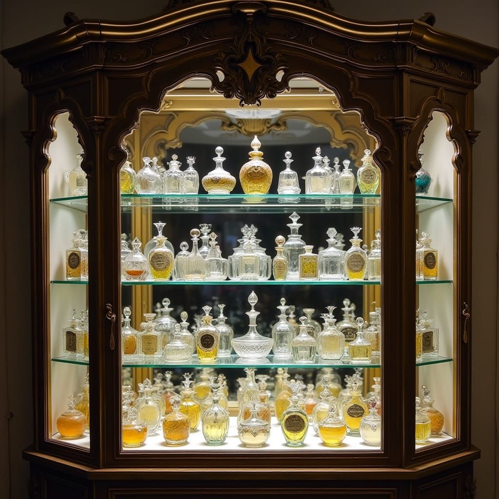 This image shows a large, ornate white and gold curio cabinet filled with crystal perfume bottles. The artwork evokes a Baroque aesthetic, reminiscent of classical painters.