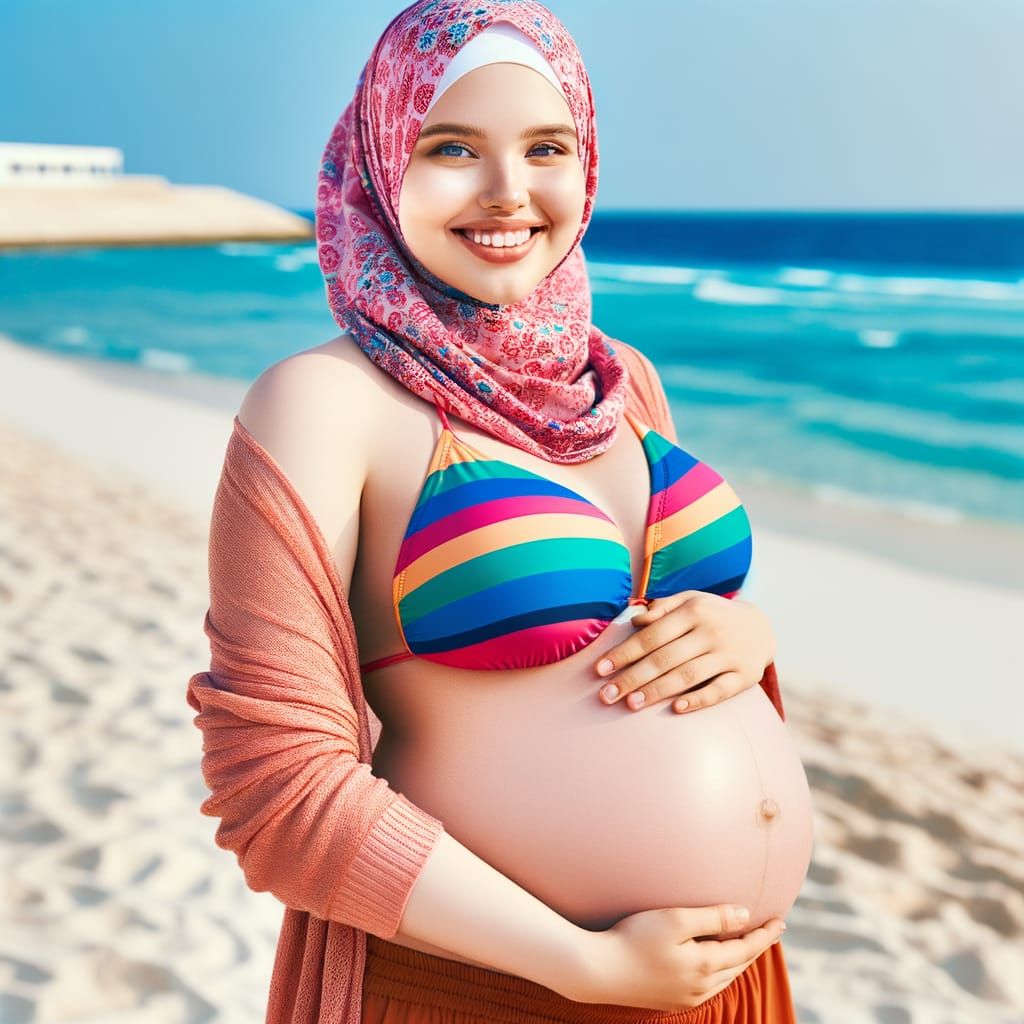 A beautiful pregnant woman with white skin, wearing a vibrant bikini and hijab, enjoys a sunny day on the beach, surrounded by positivity and confidence.