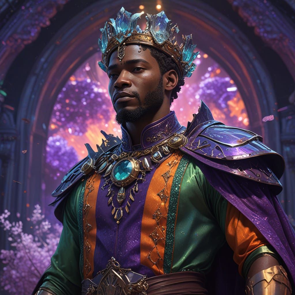 This image shows a majestic African American king standing atop a colossal bioluminescent crystal. The king is wearing a gown of woven starlight and nebulae with triadic colors in a vibrant splash art style.