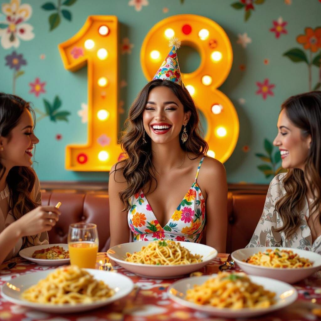 A cheerful birthday scene with a young woman celebrating her 18th birthday among friends. The background is bright and joyful, reminiscent of whimsical illustrations and lively colors.