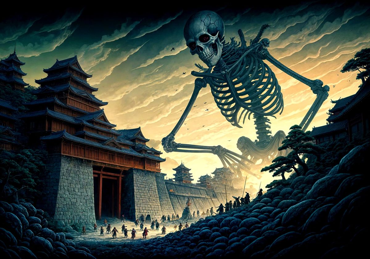 This image depicts a colossal skeleton wreaking havoc on a Japanese castle and its defenders. An onmyoji witch observes from a cliff in this scene rendered in a Ukiyo-e style.