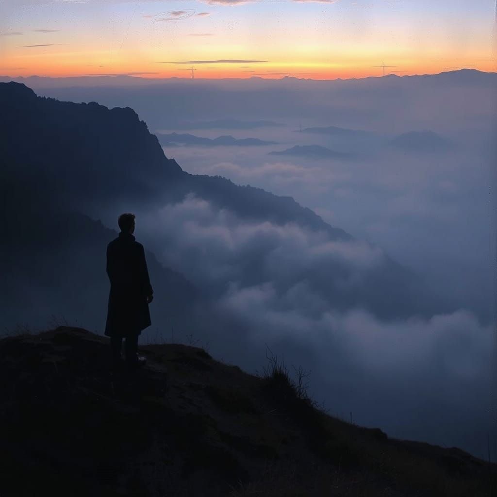 A solitary figure contemplates a misty valley at dusk, with ethereal silhouettes of loved ones fading in the distance. Rendered in a melancholic, painterly style with muted colors and soft light.
