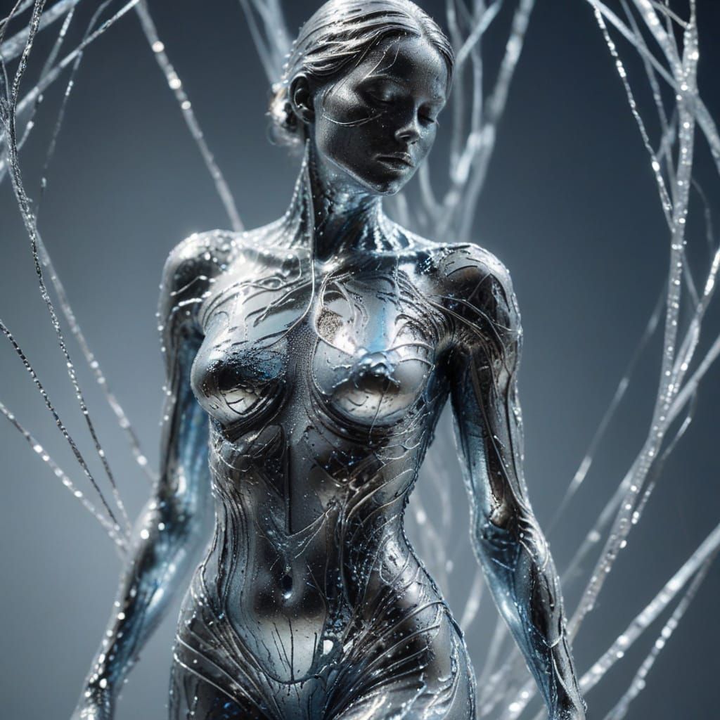 This image shows a glowing, ethereal silhouette of a girl. The figure appears to be crafted from molten, silver-blue metal, radiating a soft, calming blue light.