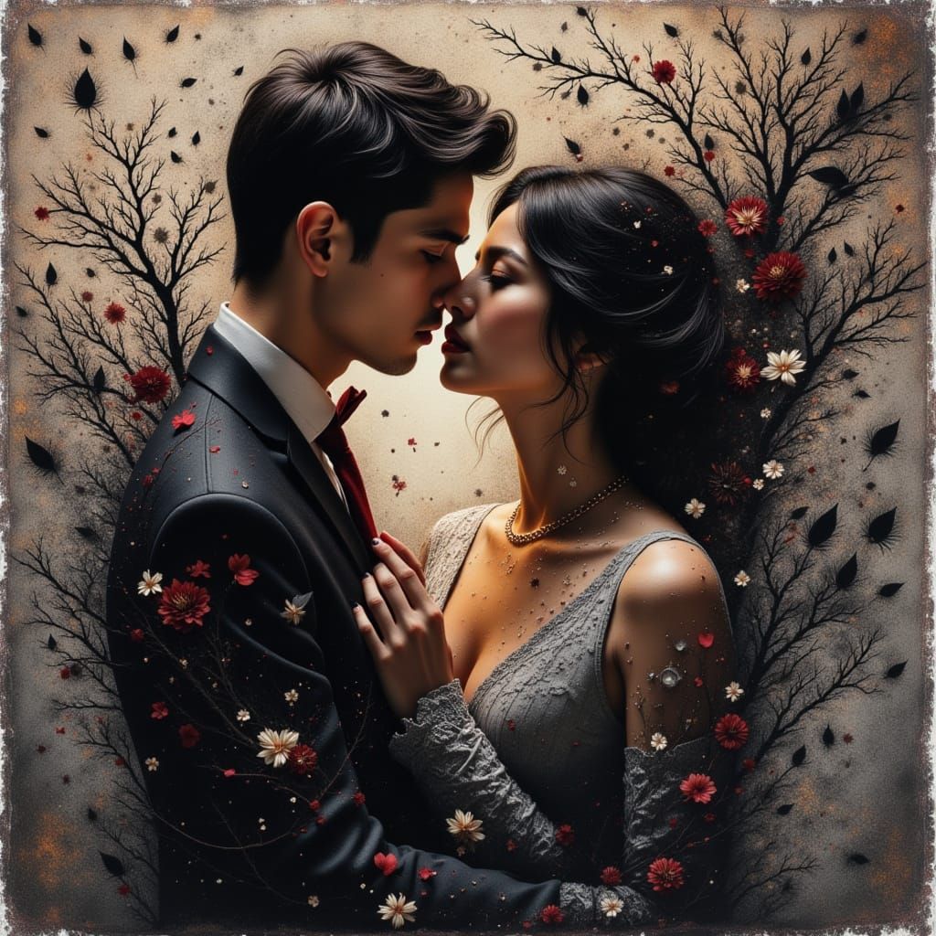 A photorealistic painting shows a couple intertwined in vivid poses, rendered in an abstract alcohol ink style with hazy figures and dramatic lighting, conveying passion and intimacy.