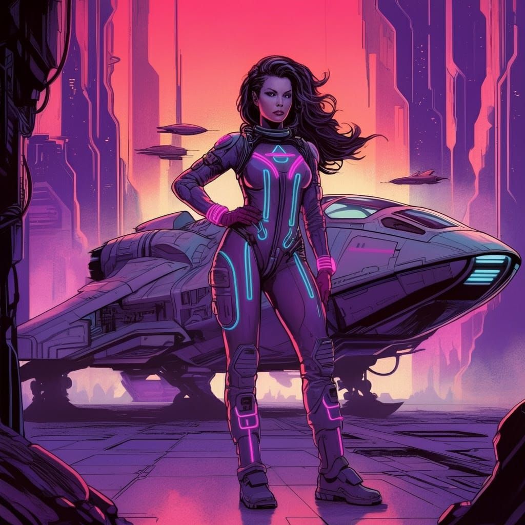 This image shows a woman in a neon jumpsuit in a futuristic city. The vibrant, hand-drawn style features bold lines and dynamic textures, in a retro science fiction aesthetic.
