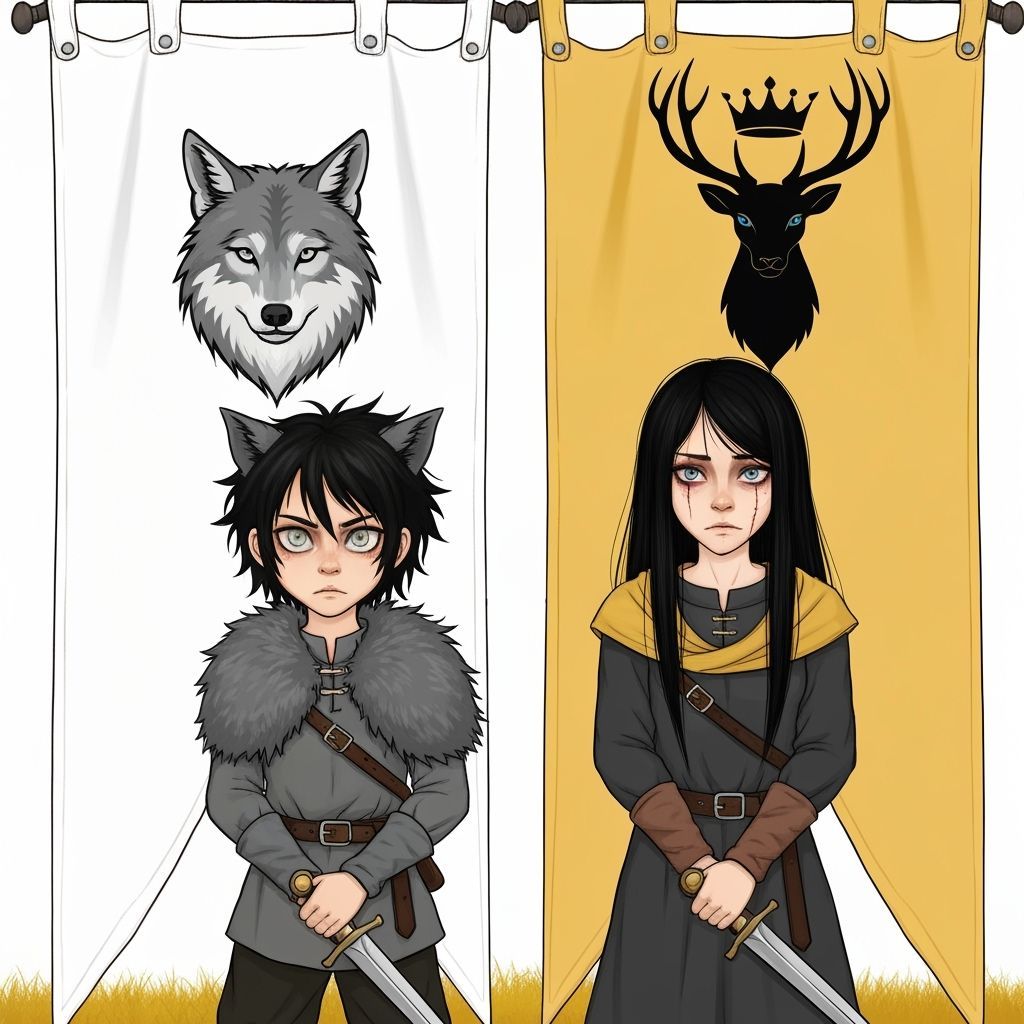 Two girls in medieval attire stand beneath banners, one featuring a wolf and the other a crowned stag. The scene captures distinct characters with unique appearances and emotional expressions.