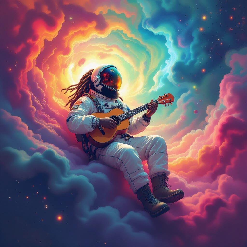 This image shows a Rastafarian astronaut playing a ukulele while floating through a colorful nebula. The image blends fantasy concept art and candy art with hyperrealistic details, in a psychedelic aesthetic.