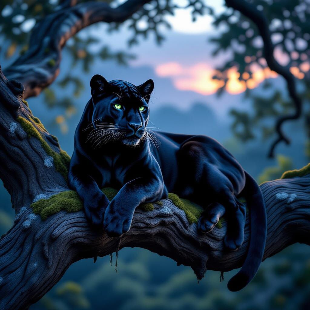 This photorealistic image captures a magnificent black panther resting regally on a mossy tree branch. Luminous green eyes and subtle fur details add to the mystical, twilight atmosphere.
