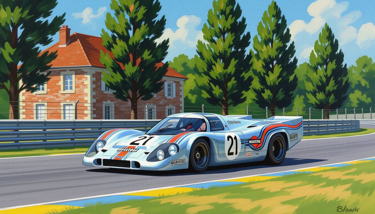 This textured oil painting captures the iconic 1970 Porsche 917LH race car with Martini livery on the Mulsanne Straight. Features a sunny day at Le Mans with background details.