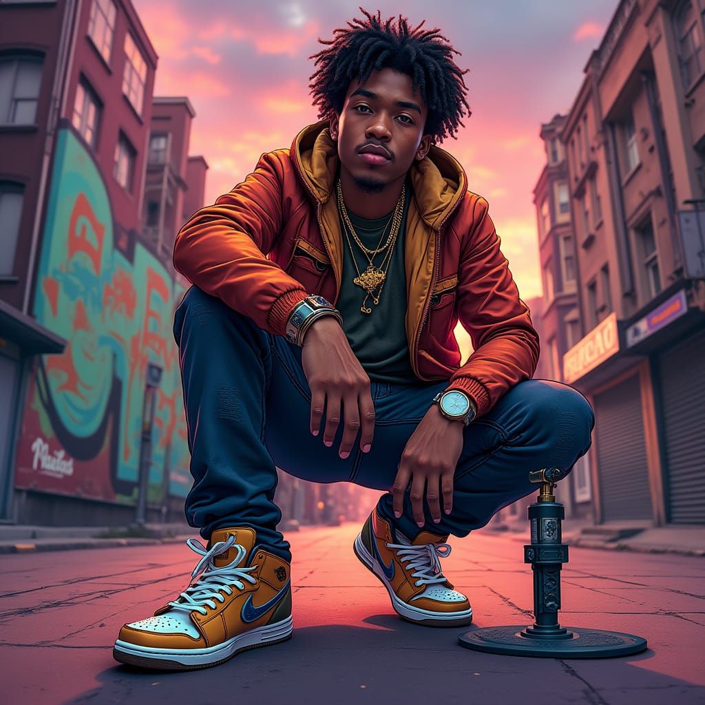 This image shows a graffiti-covered microphone, sneakers, and gold chain against vibrant city streets. The artwork captures a hip-hop aesthetic in a contemporary urban style.