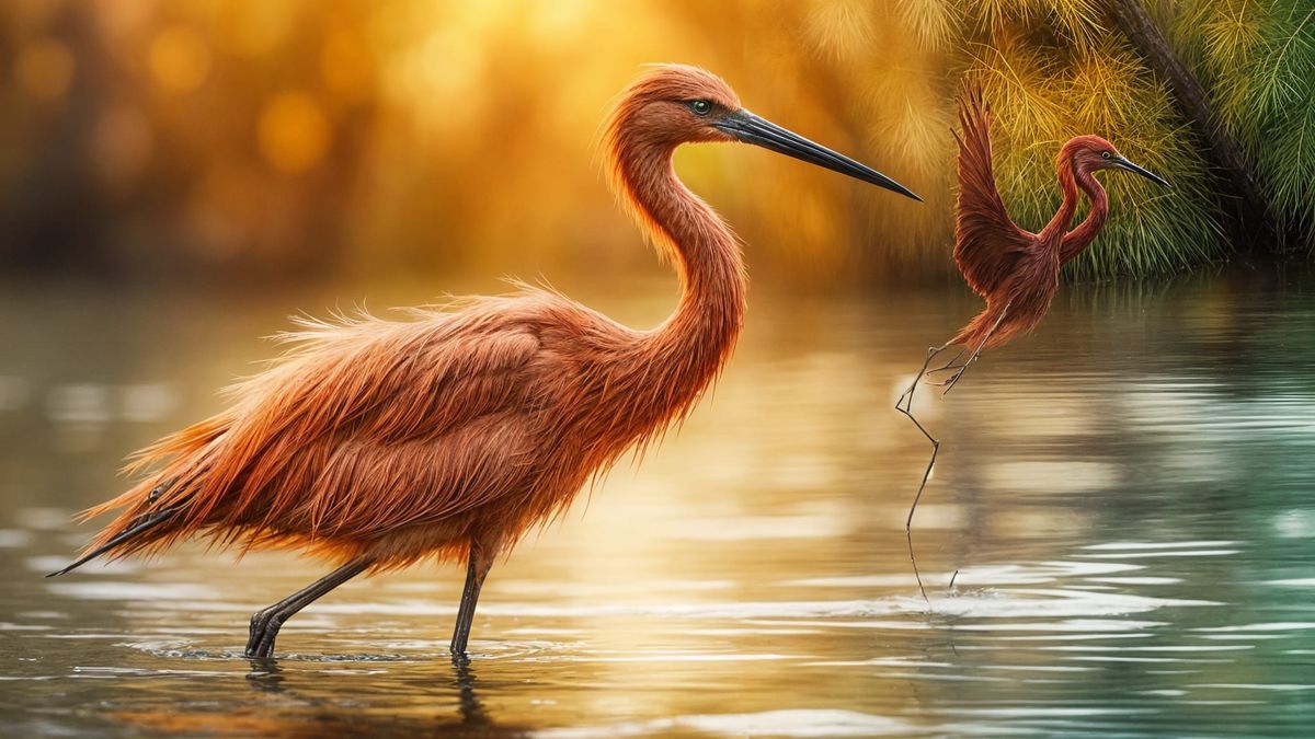 This image shows a reddish egret wading through shallow, sunlit waters. The bird's fiery plumage and the warm backdrop evoke delicate watercolor painting with soft, ethereal lighting.