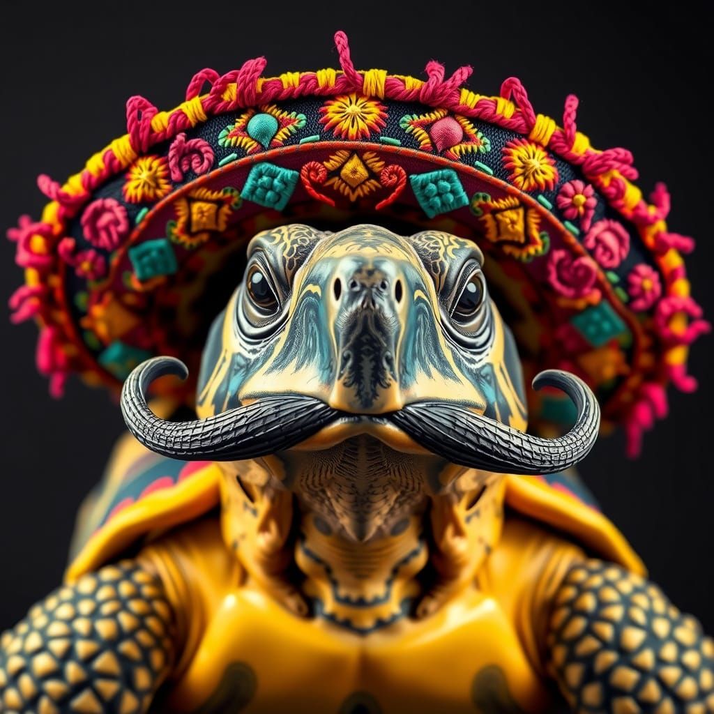 This image shows a tortoise wearing a colorful, embroidered sombrero and a long, curled mustache. The artwork features intricate textures and bold lines in a lowbrow art style.