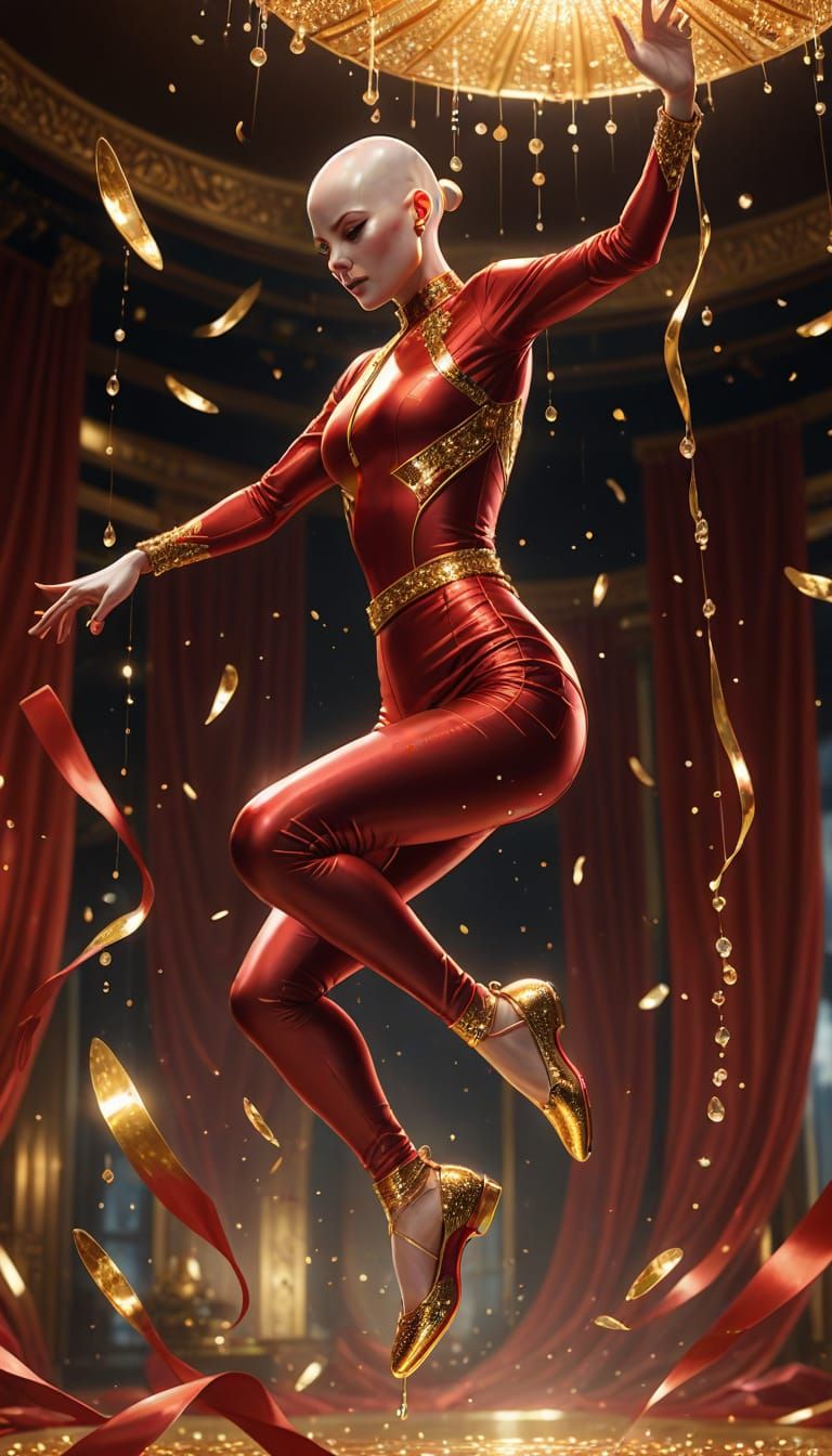 This stunning image showcases a beautiful, tall, bald woman in a dynamic, mid-air somersault pose, surrounded by glittering gold accents, vibrant colors, and a mesmerizing gradient lighting effect, creating a captivating anime-inspired masterpiece.