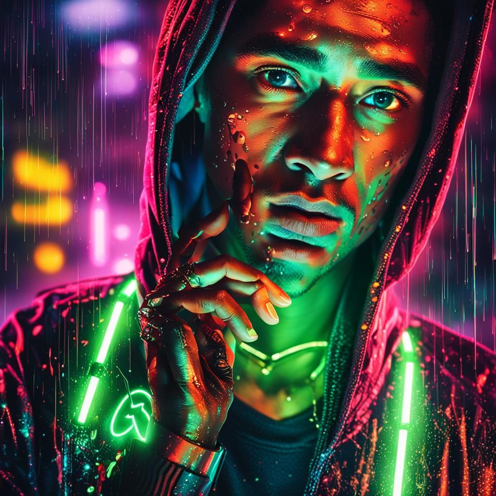 This image shows a young musician in a futuristic, rain-slicked cityscape. The digital art features a cyberpunk aesthetic with vibrant neon lights, high contrast, and cinematic, moody lighting.