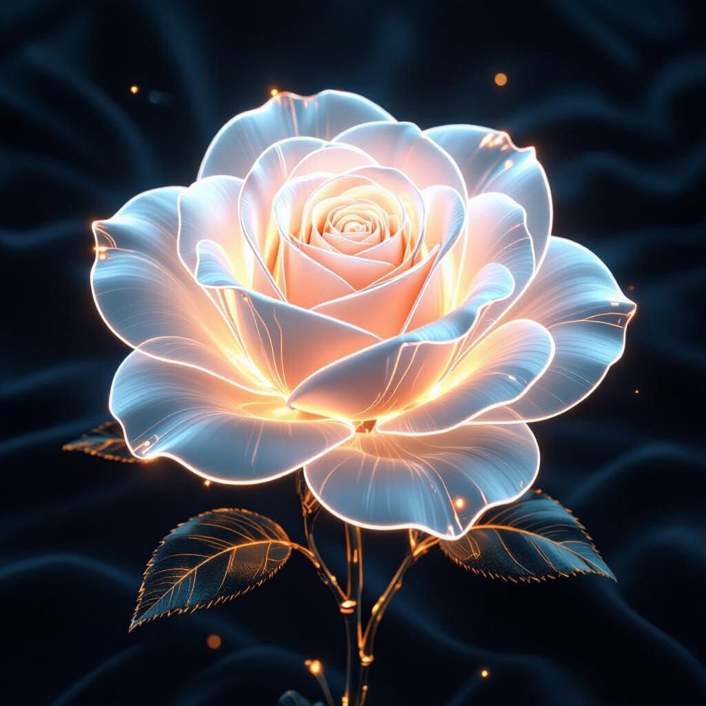 A striking picture of a neon rose against a dark background. The digital sculpture has metallic shimmer, with golden wires and soft mist creating a surreal, luminous cyber-botanical fusion.